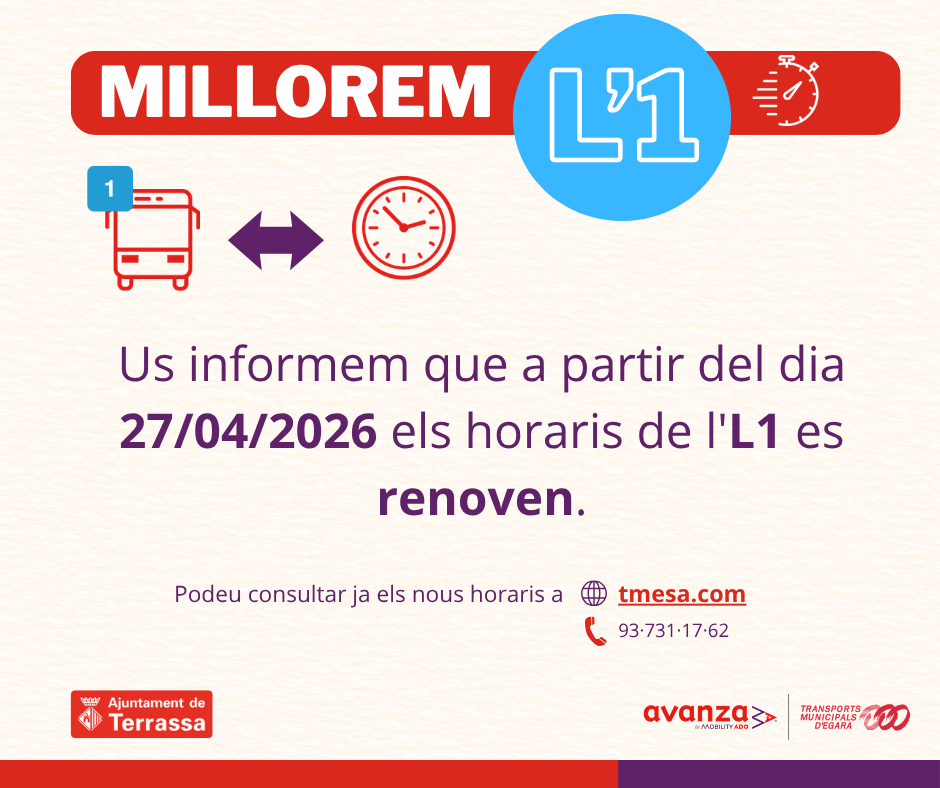 La L1 a principis d'any es va actualitzar amb els temps reals de recorregut. Després d'una escolta activa d'associacions, escoles i usuaris, a partir del dia 27/04, els serveis 2026 milloren la freqüència i l'amplitud horària. Els nous horaris donaran cobertura a les entrades dels treballadors/es de l'Hospital i les perllongacions a Mossèn Homs, sense descuidar les entrades i sortides dels col·legis . Ja es poden consultar a tmesa.com