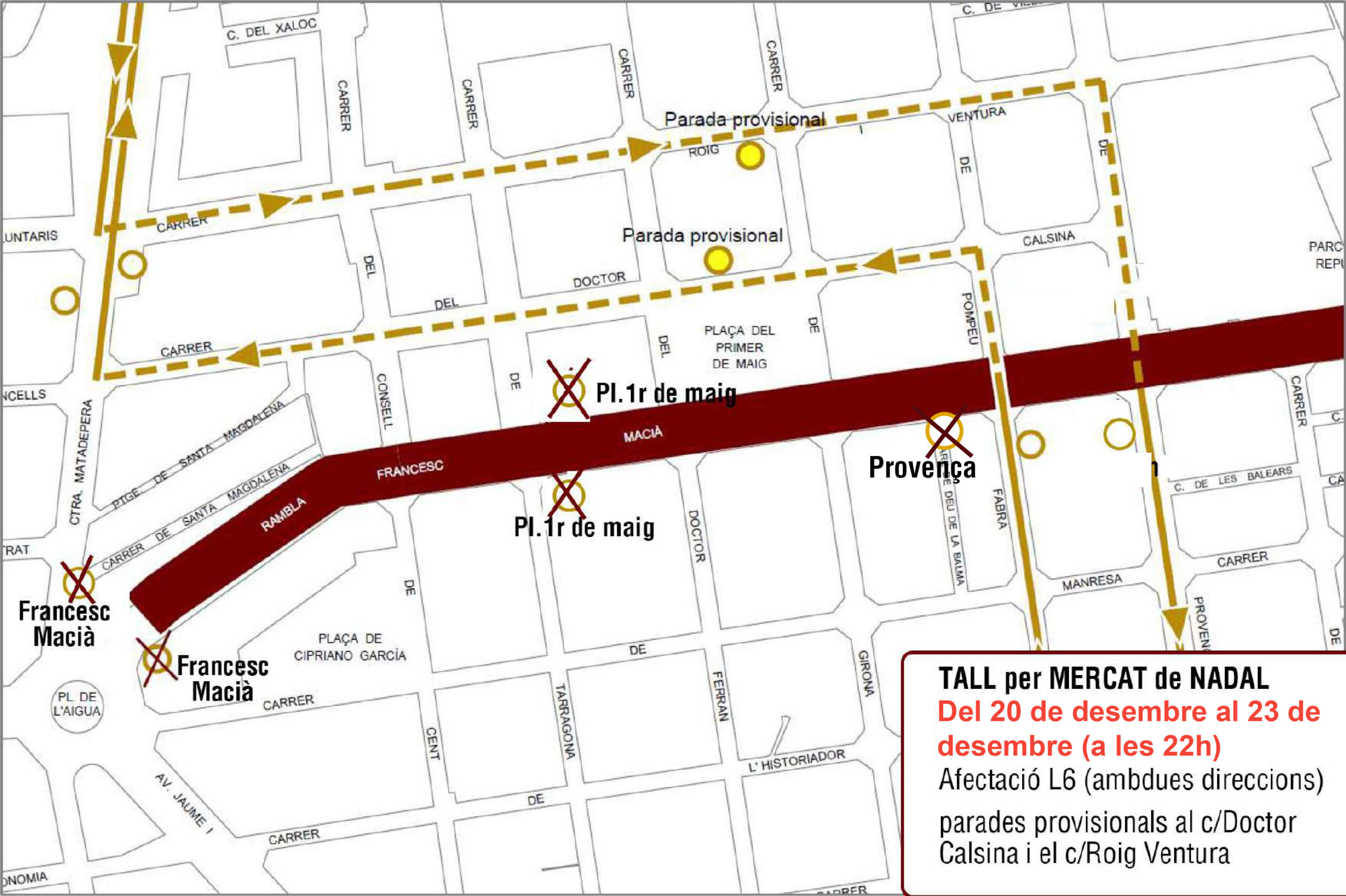 - Degut al tall pel MERCAT de NADAL, la Rambla Francesc Macià queda tallada i els autobusos modificaran el seu recorregut.